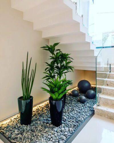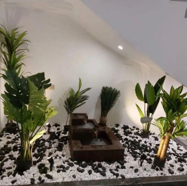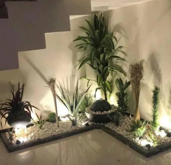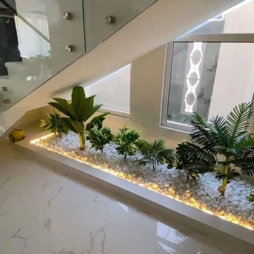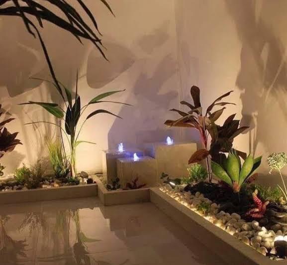 حديقة داخلية صغيرة مزروعة بالنباتات الطبيعية أو الصناعية.
