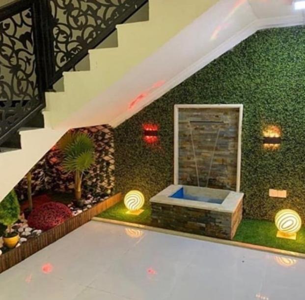 شلال جداري أو نافورة صغيرة تضيف صوت الماء الهادئ للمكان.